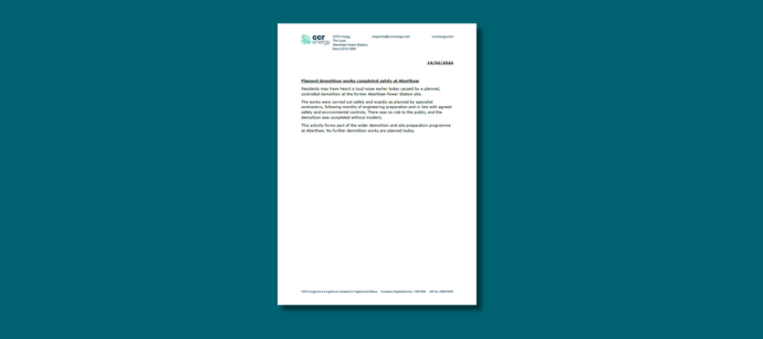 Residents may have heard a loud noise earlier today caused by a planned, controlled demolition at the former Aberthaw Power Station site. This activity forms part of the wider demolition and site preparation programme at Aberthaw.